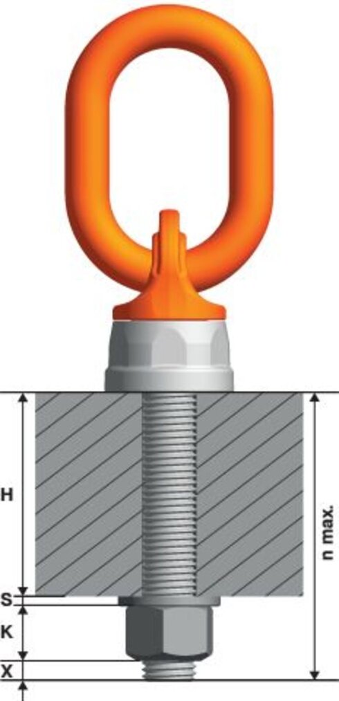 Ball-bearing 360° under load rotatable lifting point. High resistant lifting eye 180° movable. The special screws are 100% crack-tested as well as protected against corrosion. The table with the load capacities depending on the method of lifting as lifting gear, number of legs and angle of inclination is a part of the user manual and packed together with each lifting point.