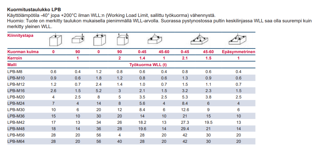 - Huomautus: Ennen käyttöä tarkista WLL-kaavio valitaksesi oikean LPB:n sovellukseesi
