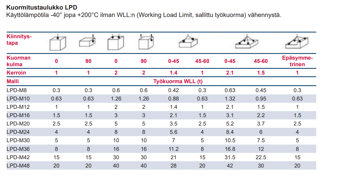 - Laaja lämpötila-alue: LPD-nostosilmukka on optimoitu käytettäväksi -40°C - +200°C ilman WLL:n vähennystä, sallittujen WLL-vähennysten kanssa korkeammissa lämpötiloissa, mikä varmistaa soveltuvuuden erilaisiin ympäristöihin.
